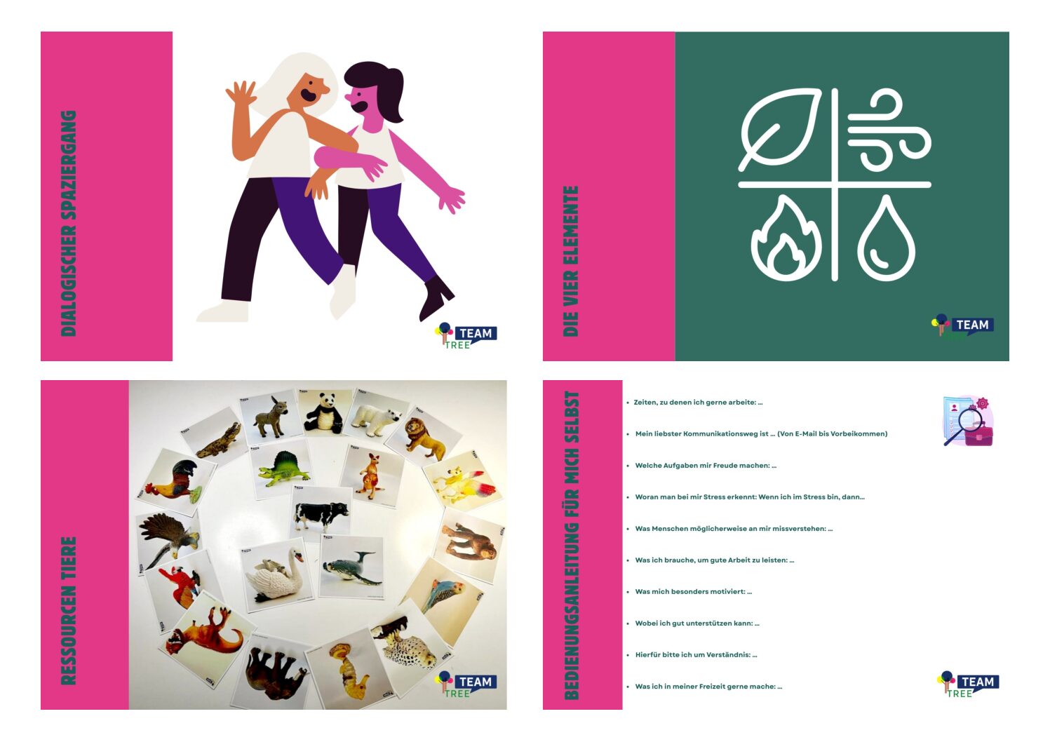 Auf der ersten Seite sind die Anleitungen und auf der Rückseite kreative und ansprechende Illustationen. Die Visualisierung kann einfach bei einigen Übungen für alle Teammitglieder kopiert werden oder bei anderen Übungen als Bodenanker verwenden werden. Weiterhin befinden sich in dem Set eine bunte Mischung Pfeifenputzer für die “Teamskulptur” und das Team Tree Tier Kartenset für die Übung “Ressourcentiere”. Sie könne also dirkt loslegen mit “Teamentwicklung durchs Jahr” und monatilich eine der Übungen durchfürhren. Ob Sie dabei der Reihe nach vorgehen oder eine individuelle Reihenfolge festlegen ist Ihnen überlassen.